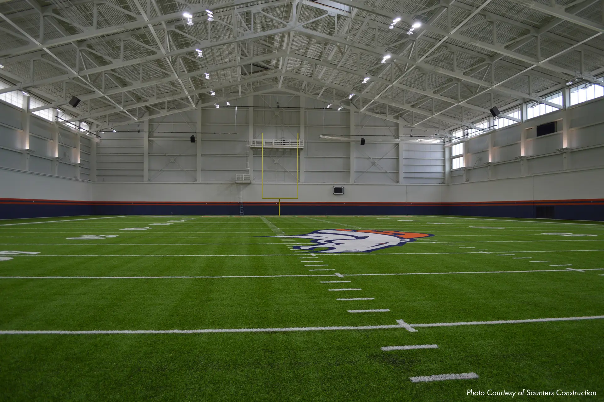 Heath Steel supplied and erected roof and wall cladding for the Denver Broncos Indoor Practice Facility. The building consists of a 3-story, 85,000 sq. ft. field house with a full size regulation playing field and 30,000 sq. ft. of support facilities for locker rooms, treatments rooms, VIP area, media area and team store. Building construction is of structural steel and Heath supplied and installed metal roof and wall panel systems. The roof system consisted of 2-layer polyiso insulation, ice and water shield membrane, Chief standing seam roof, gutter, downspouts and snow guards. The wall system included Kingspan insulated panels and Morin single skin metal panel over Kingspan insulated Karrier panels. Other building details include clerestories, eave and gable overhangs, parapets, custom flashings and special colors to match team colors. Despite challenges including project starting behind schedule, adverse weather, additional unplanned work and material supply issues the project was completed in time for the Broncos to practice indoors during the latter part of the 2014 season.
