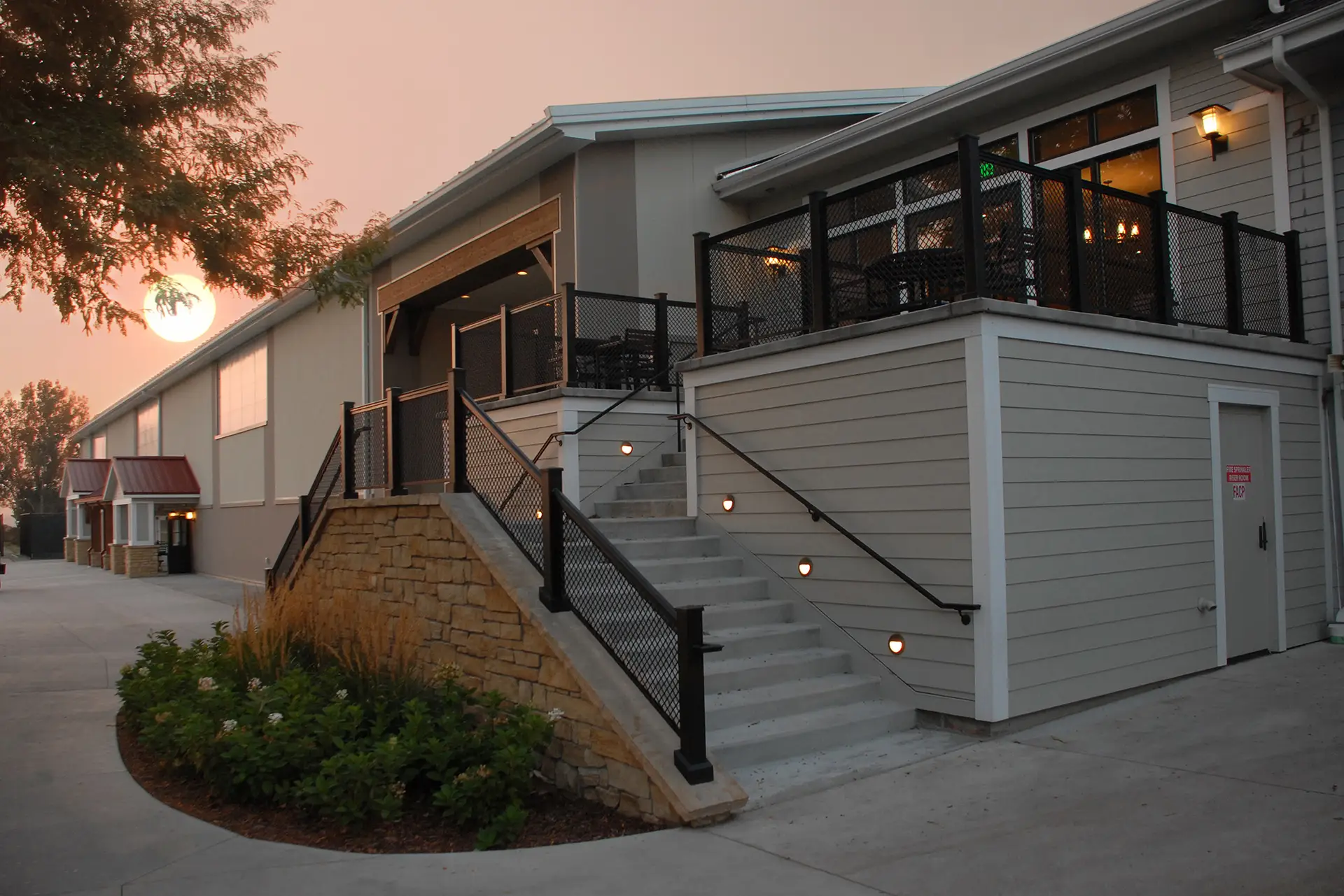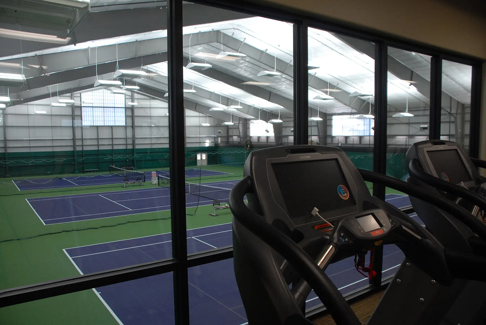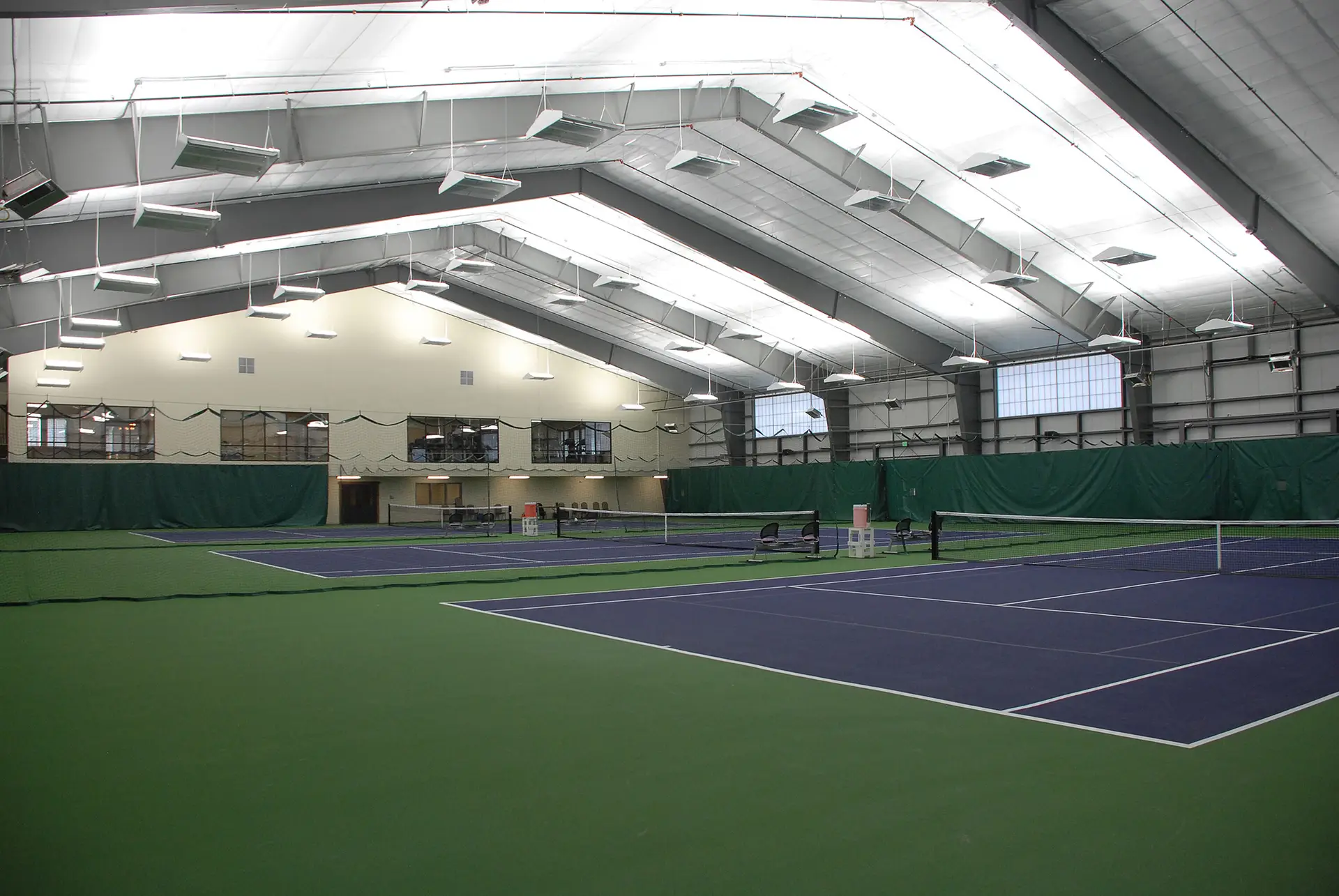 Chief building with clear span design over three full size tennis courts. Designed to complement existing Country Club facilities, the building features a Chief Buildings standing seam roof with cupolas, Kingspan insulated wall panels in a two color Granitstone stucco finish, eave extensions and canopies. The interior features a viewing mezzanine and bright white simple saver roof insulation. This building won the Chief Buildings 2014 Sports-Entertainment Honorable Mention Award for Building of the Year.